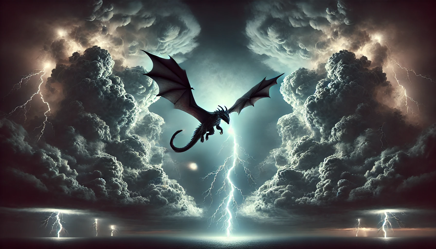 I first saw the sky. The sky was dark. I saw a cloud to the left and to the right. Then I saw this strike of lightning down the middle of the two clouds. The next thing that happened was a dragon appeared and began flying in the sky. He went about in a circle as if swirling in the sky. His tail seemed to follow the swirling of its body. Then I saw this angel descend into the same spot that lightning struck in the sky. This angel came through and cut the head off the dragon in the sky.